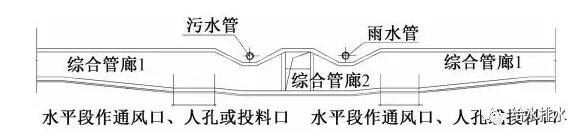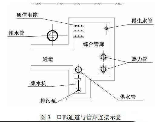 (1)通風口、人孔及投料口等口部與管廊之間的通道和其他管線交叉時,綜合管廊向下折翻,既要確保通道凈高(不小于1.5m)的前提下保證通道頂在排水管以下(每一處都要結合排水管網施工圖詳細計算),又要避開通道在管廊開口處的管線遮擋以免局部管廊埋深和凈高加大。為減小管廊局部下臥深度,以便減小施工難度、降低建設投資,各口部及通道均設在給水及電信線纜一側。口部通道與管廊連接示意見圖3。