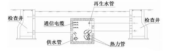 廊內一側敷設給水管道及通信電纜,給水管在下,通信電纜在上;另一側敷設熱力管道,其上方預留熱水及再生水管線安裝條件;廊內中間考慮0.9m的檢修通道。