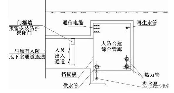 各類管線過人防合建管廊側壁處,均設計安裝防護套管。供水、再生水及熱力管道過人防通道外墻或臨空墻時,其內側加設防爆波閥門。