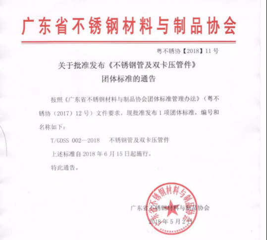 5月2日,由廣東省不銹鋼材料與制品協會提出并歸口的廣東省《不銹鋼管及雙卡壓管件》團體標準正式批準發布,將于6月15日起施行。